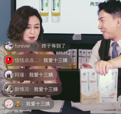 雖然直播業務不是很熟練,但是當場直播許多商品迅速就被賣光,可見觀眾對于關之琳的喜愛,彈幕上也經常出現“我愛十三姨”的內容。