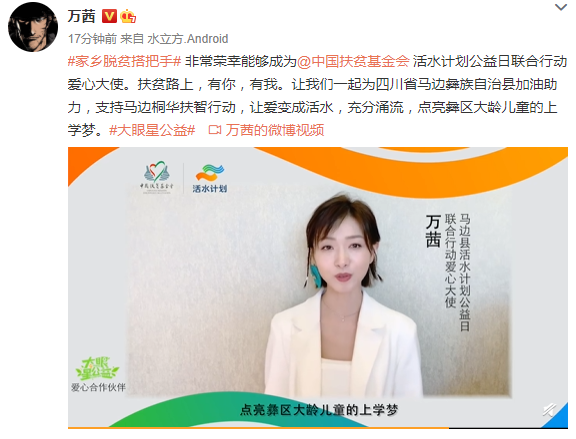 萬茜及其團隊沒有對此事再做任何回應,9月10日,萬茜更新社交平臺動態,但是并未回應爭議,而是做起了公益。她寫道:“非常榮幸能夠成為中國扶貧基金會活水計劃公益日聯合行動愛心大使。扶貧路上,有你,有我。讓我們一起為四川省馬邊彝族自治縣加油助力,支持馬邊桐華扶智行動,讓愛變成活水,充分涌流,點亮彝區大齡兒童的上學夢。”