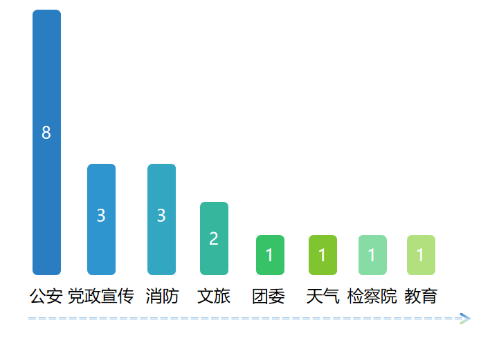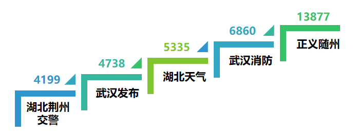 整體來看,排名前20的政務微博,在區域分布上主要集中在省直(7家)、武漢(6家);再次是隨州(3家)、宜昌(2家);荊州、十堰各有1家微博號進入前20名。從領域分布來看,公安系統微博號占據半壁江山,有8家入圍;黨政宣傳、消防系統均有3家微博號入選;文旅系統有2家微博號進入TOP20;團委、天氣、檢察院和教育領域微博號各占據1個席位。