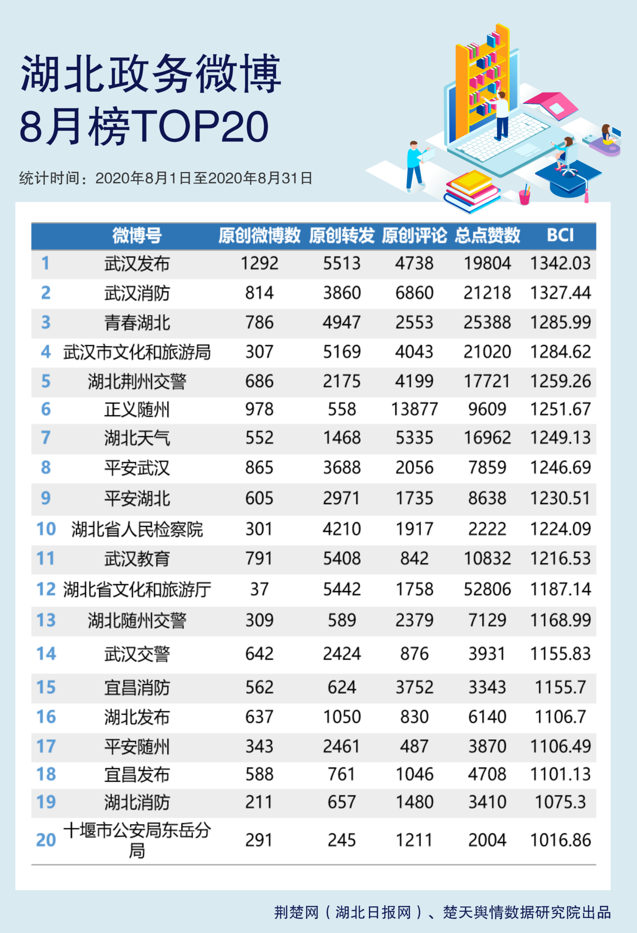 9月10日,由荊楚網(湖北日報網)、楚天輿情數據研究院制作的湖北政務微博8月榜發布。