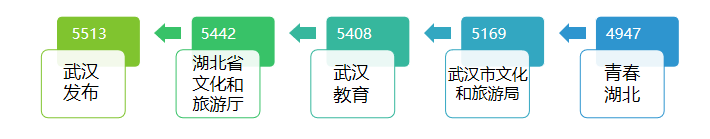 8月原創轉發數較上月整體有小幅下滑。具體來看,@武漢發布 雖以5513次排名第一,但較上月減少了2544次;@湖北省文化和旅游廳、@武漢教育、@武漢市文化和旅游局 緊隨其后,該項指數均超過了5000次,@青春湖北 以4947次排名第五。