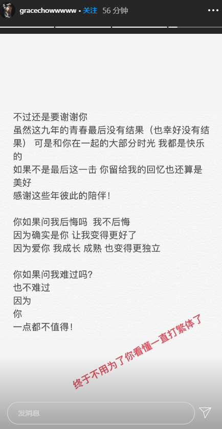 在今年4月,周揚青在社交平臺發(fā)長文正式宣布與相戀9年的男友羅志祥分手,并曝光對方私生活混亂的種種事跡。她表示當時的他們已分手一段時間,寫這篇長文也絕不是報復心態(tài)。也在文中感謝羅志祥曾對自己的好,讓自己能變得更優(yōu)秀,但自己并不因分手難過,直言“你一點都不值得”。周揚青還特意在社交平臺上寫道“終于不用為了你看懂一直打繁體了”,之后周揚青發(fā)動態(tài)均使用簡體字。