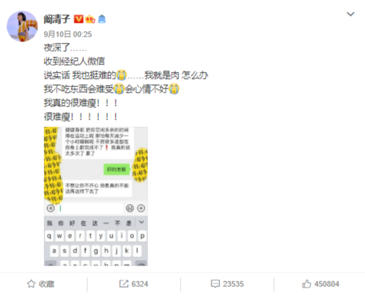 據悉,10日,闞清子被經紀人逼減肥和馬思純瘦了十斤紛紛登上熱搜榜,引發了大家對女明星身材的討論。而這次張馨予公開呼吁不要對女演員胖瘦太苛刻,不知眾網友是否同意她的觀點。