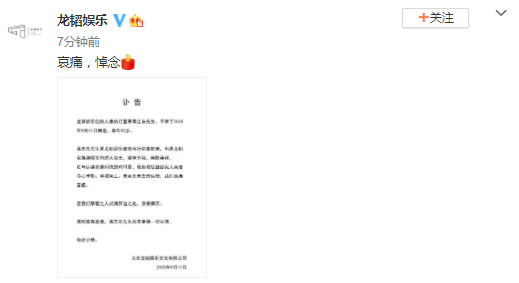 網易娛樂9月11日報道 剛剛,黃子韜公司發布訃告,稱龍韜娛樂創始人兼執行董事黃忠東先生于2020年9月11日因病去世,享年52歲。一路走好。