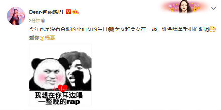 除了慶生文字外,熱巴還配上了一張圖片。使用的配圖,是一張表情包,上面寫著“我想在你耳邊唱一整晚的rap”。