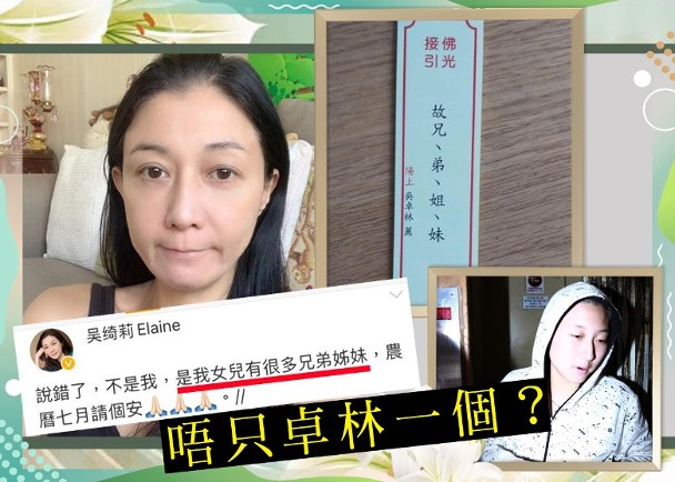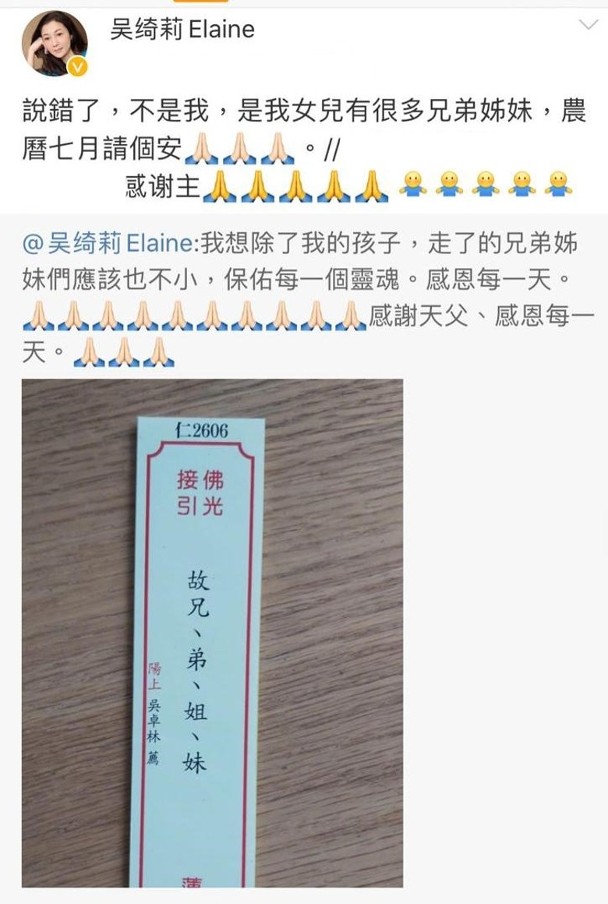 吳綺莉更寫道:“我想除了我的孩子,走了的兄弟姊妹們應該也不?。ㄉ伲?,保佑每一個靈魂。感恩每一天。感謝天父、感恩每一天?!奔戳罹W友熱議,以為她是為自己親友做超度法事,不過吳綺莉隨即留言解釋:“說錯了,不是我,是我女兒有很多兄弟姊妹,農歷七月請個安?!钡髤蔷_莉卻刪除發文。