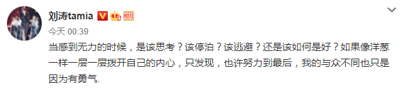 網(wǎng)易娛樂9月15日報道 9月15日凌晨,劉濤崩潰在社交平臺發(fā)文:“當感到無力的時候,是該思考?該停泊?該逃避?還是該如何是好?如果像洋蔥一樣一層一層撥開自己的內(nèi)心,只發(fā)現(xiàn),也許努力到最后,我的與眾不同也只是因為有勇氣。”
