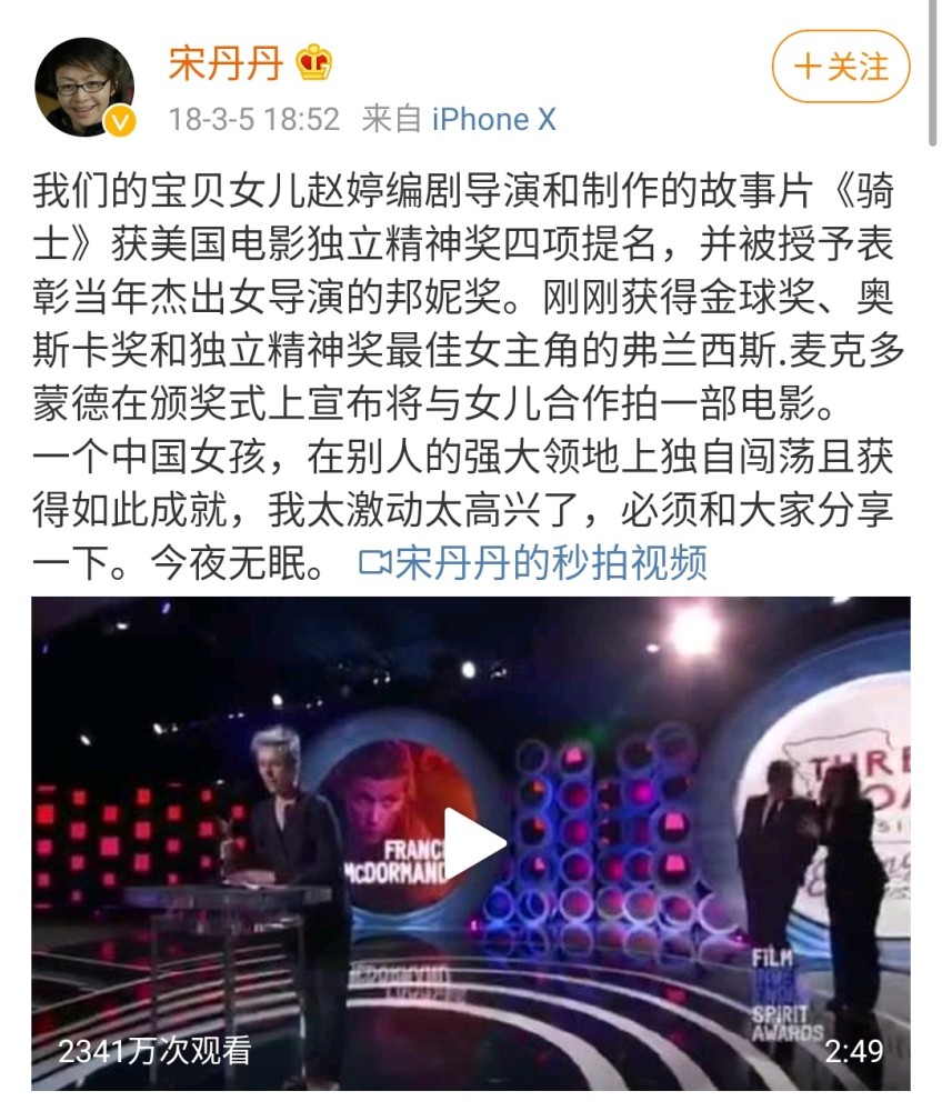 據悉,趙婷還是著名演員宋丹丹的繼女。2018年,她自編自導的第二部作品《騎士》獲得第70屆戛納國際電影節藝術電影獎、第33屆獨立精神獎邦妮獎,宋丹丹曾為此高興得“今夜無眠”。