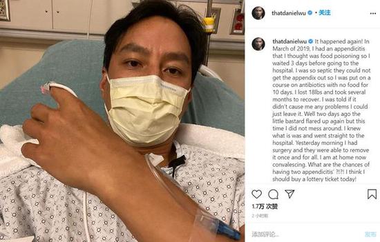 據(jù)悉,此前在去年12月31日,吳彥祖就詳細(xì)說過自己患闌尾炎入院的經(jīng)歷,當(dāng)時(shí)他以為是食物中毒沒注意,直到闌尾破裂化膿才治療,也因此差點(diǎn)喪命。