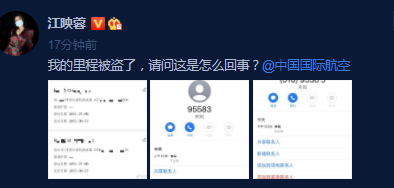 9月8日,江映蓉曬出一張打碼的身份信息截圖及聯(lián)系電話截圖,透露自己的里程被盜了,同時(shí)發(fā)文詢問航空公司:“我的里程被盜了,請(qǐng)問這是怎么回事”。隨后,國航回復(fù)稱:“已經(jīng)關(guān)注您提及的事情,我們將您的問題反饋給相關(guān)部門盡快解決。”