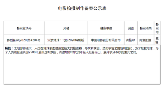 據悉,國家電影局2020年3月立項公示,《流浪地球:飛躍2020特別版》立項備案。此前據中國電影報道消息,華夏董事傅若清在采訪中透露,重映版《流浪地球》將增加10至15分鐘左右的內容,且不單純是加片尾花絮和舊素材的增補,還將有新創作的部分。