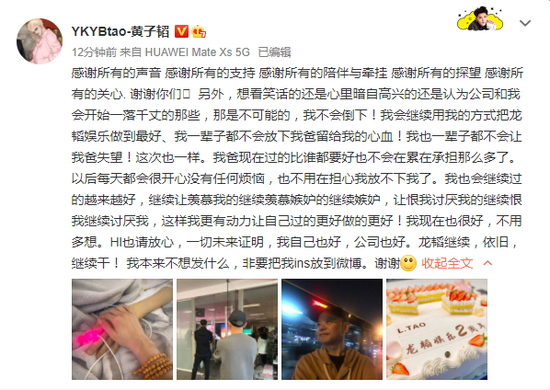 15日,黃子韜在父親病逝后發(fā)文。他在文中感謝了大家的陪伴與支持、探望和關(guān)心,表示自己不會倒下,會繼續(xù)把龍韜娛樂做到最好,“我一輩子都不會放下我爸留給我的心血!我也一輩子都不會讓我爸失望!我爸現(xiàn)在過得比誰都要好,也不會再累再承擔(dān)那么多了。”