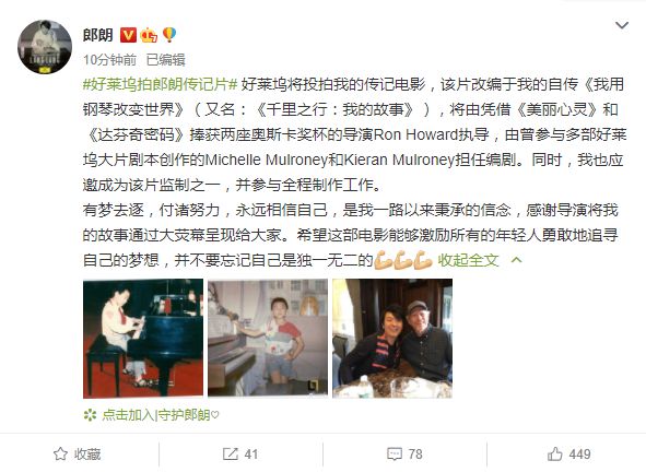 網易娛樂9月23日報道 據外媒報道 《美麗心靈》《帕瓦羅蒂》導演朗·霍華德將執導一部鋼琴家郎朗的傳記片,改編自郎朗自傳《千里之行:我的故事》,將在中國和美國拍攝。隨后,郎朗發文確認了這一消息,并自曝將應邀成為該片監制之一,并參與全程制作工作。