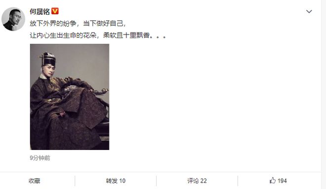 網易娛樂9月23日報道 23日,何晟銘在其社交平臺上發文:“放下外界的紛爭,當下做好自己,讓內心生出生命的花朵,柔軟且十里飄香”,并配了一張早期拍攝的電視劇《少年四大名捕》的劇照,疑似回應此前網友對他“揩油女主持”的質疑。