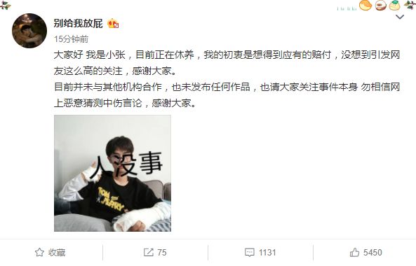 網易娛樂9月23日報道 今日,因手受傷尋求媒體幫助進行維權的小張對自己因顏值走紅事件作出回應,他表示現在自己在休養,初衷是得到應有的賠付,感謝網友們的關注。