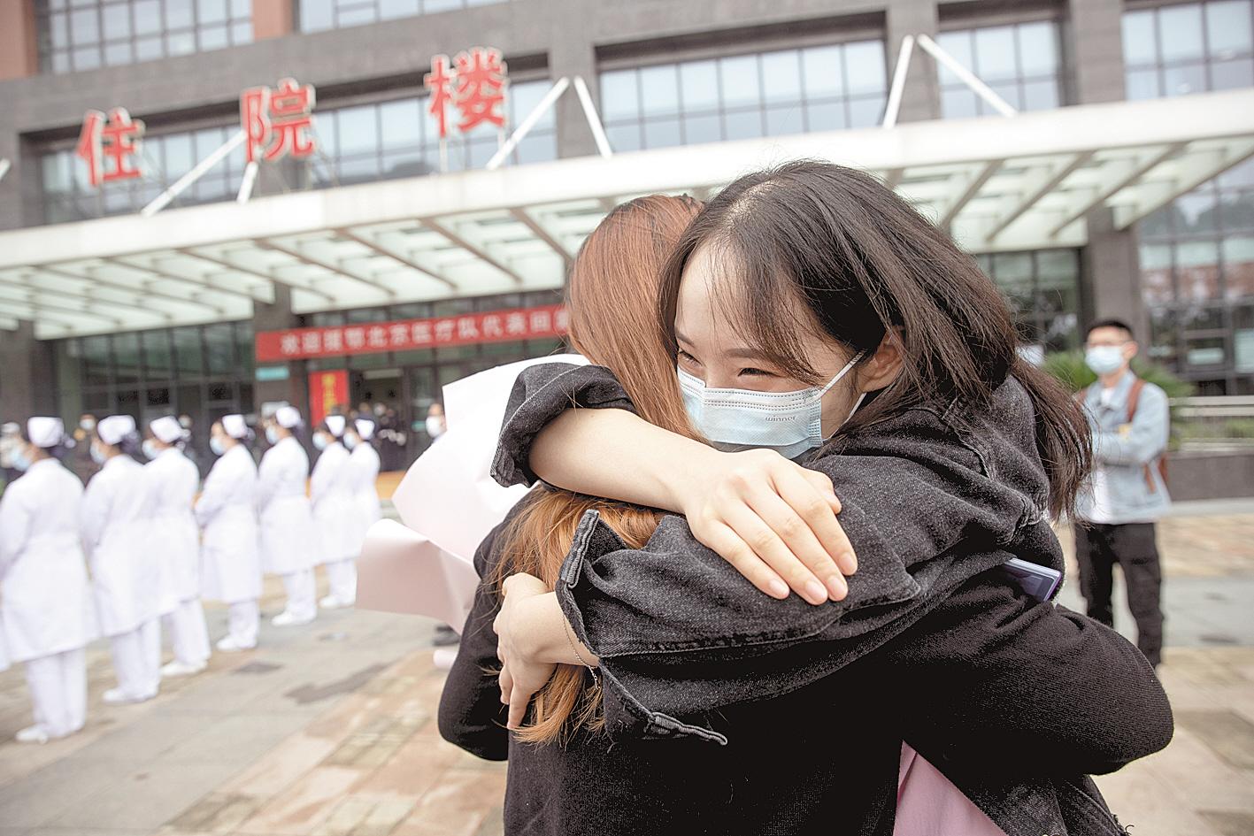 9月23日,北京援鄂醫療隊代表和前來迎接的武漢協和醫院西院醫護人員相互擁抱。當天,乘中國國際航空“冬奧冰雪號”首航航班抵達武漢的北京援鄂醫療隊代表來到武漢協和醫院西院,探望曾經共同抗疫的戰友們。時隔6個月,再次重返曾經戰斗過的地方,不少醫療隊員流下了激動的淚水,和前來迎接的醫護人員熱情相擁。 (湖北日報全媒記者 柯皓 通訊員 金煦 攝)