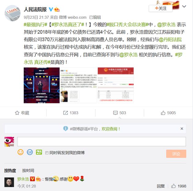 節目播出后,人民法院報在社交平臺發文證實羅永浩的確在還錢,稱:“經我們與丹陽法院核實,該案在執行過程中達成執行和解,在今年6月份已經全部履行完畢。我們還查詢了中國執行信息公開網,目前已查詢不到與羅永浩相關的執行信息。”