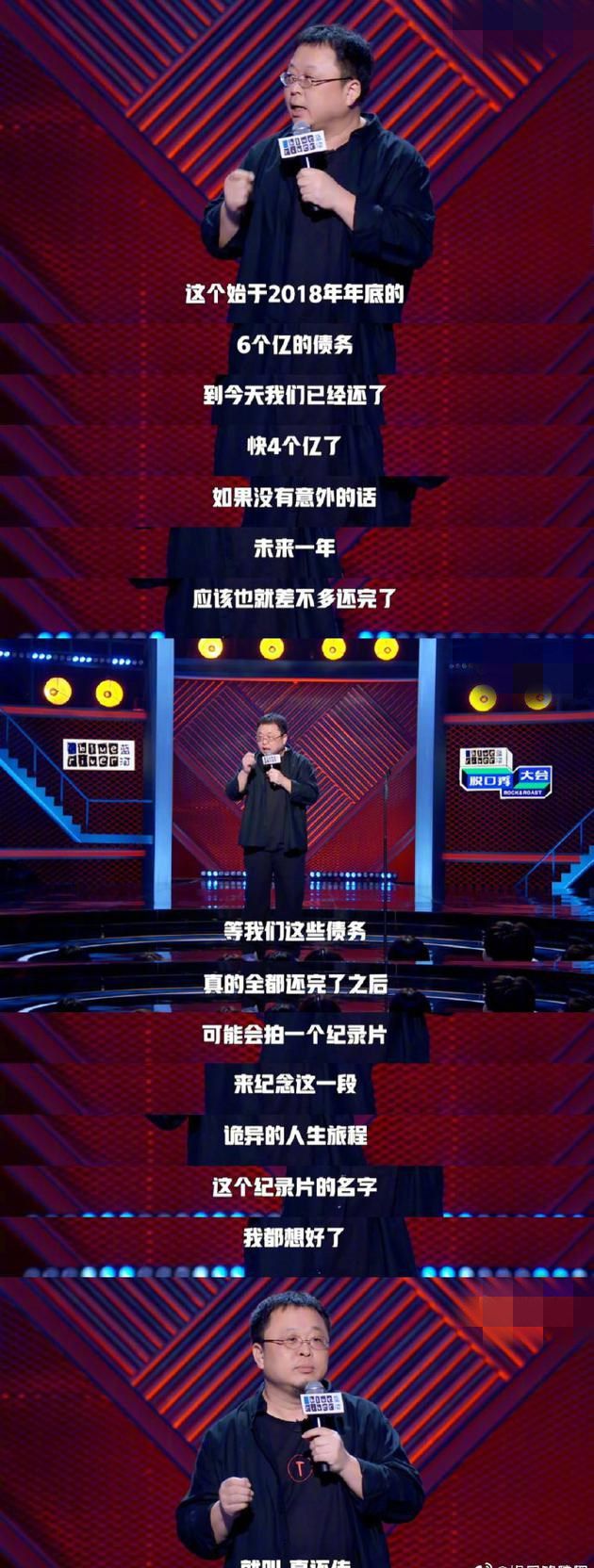 網易娛樂9月24日報道 最新一期《脫口秀大會》迎來了總決賽,領笑員羅永浩在表演時自曝自己在2018年底的6個億欠款,已還了近4億,沒有意外的話最近一年里應該能還完欠款。羅永浩還吐槽了自己的還債經歷,稱做電商直播,游戲代言后被人吐槽“投機”,但他卻認為還債更應該湊熱點,還調侃債務還清后自己要拍一部《真還傳》。