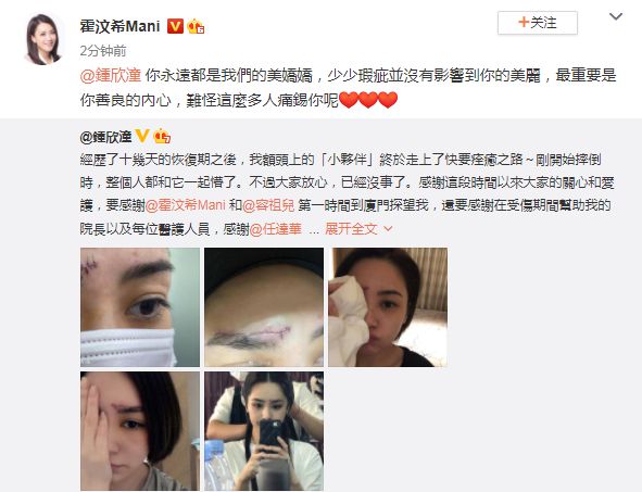 網易娛樂9月24日報道 9月24日,阿嬌曬出自己額頭受傷的照片,透露傷口已經快要痊愈:“要感謝霍汶希和容祖兒第一時間到廈門探望我,還要感謝在受傷期間幫助我的院長以及每位醫護人員,感謝任達華、惠英紅、蔡卓妍、林峯,還有我身邊的工作人員,是因為你們的幫助才讓傷口可以恢復地那么快?!?/p>