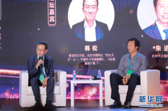 9月26日,科幻作家韓松(左)在鄭州舉行的中國(guó)科幻電影創(chuàng)作高峰論壇上發(fā)言。 新華社記者 任沁沁 攝
