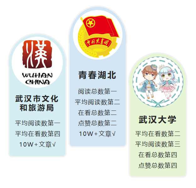 本期在看總數(shù)最大值再創(chuàng)新高——“平安黃岡”以54237次排名第一,是第二名“青春湖北”(22875次)的兩倍之多,平均在看數(shù)也高達(dá)417次,獲得雙料第一;“健康湖北”“武漢大學(xué)”分列第三、四名,指數(shù)均超過1萬次。“華中科技大學(xué)同濟(jì)醫(yī)院”和“武漢市文化和旅游局”雖在看總數(shù)表現(xiàn)一般,但平均在看數(shù)達(dá)241次和202次,排名該項指數(shù)第三、四名,助力WCI指數(shù)排名靠前。