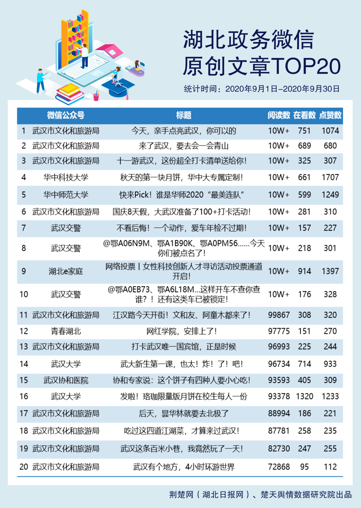 9月,原創(chuàng)文章榜單TOP20的推文內(nèi)容主要涉及文化旅游、校園生活、政務(wù)服務(wù)、知識科普等話題,涵蓋教育、醫(yī)療、文旅、公安等領(lǐng)域。其中“武漢市文化和旅游局”有10篇文章入圍,占據(jù)原創(chuàng)文章榜半壁江山;“華中科技大學(xué)”“武漢大學(xué)”教育類微信號共有4篇文章上榜,“武漢交警”有3篇10W+原創(chuàng)文章進(jìn)入前十,“湖北e家庭”“武漢協(xié)和醫(yī)院”“青春湖北”各有1篇文章上榜。