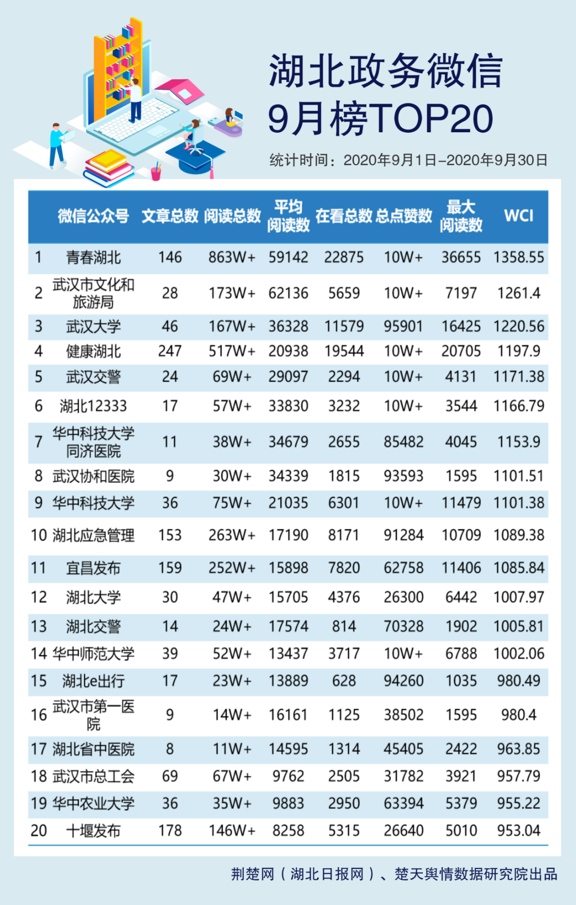 本期,閱讀總數(shù)前五名分別是“青春湖北”“健康湖北”“湖北應(yīng)急管理”“宜昌發(fā)布”“武漢發(fā)布”。從平均閱讀數(shù)來看,前三名與上期保持一致,分別是“武漢市文化和旅游局”“青春湖北”和“武漢大學(xué)”,但數(shù)值均有所減少。值得注意的是,“湖北省人事考試院”平均閱讀數(shù)達(dá)19351次,排名前十,但9月因僅發(fā)布4篇推文,一定程度導(dǎo)致WCI指數(shù)排名靠后。
