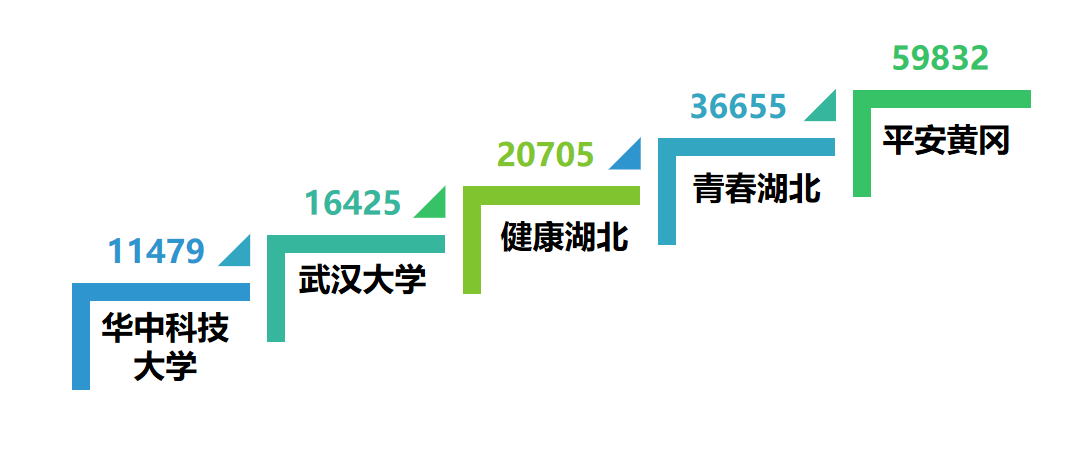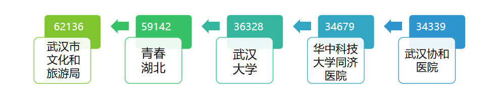 從點贊總數(shù)來看,整體有小幅上升,有8家微信號指數(shù)超過1萬次,其中“平安黃岡”以59832次位列第一,遠(yuǎn)高于其他微信號,“青春湖北”以36655次排名第二,“健康湖北”“武漢大學(xué)”“華中科技大學(xué)”分列第三、四、五名。