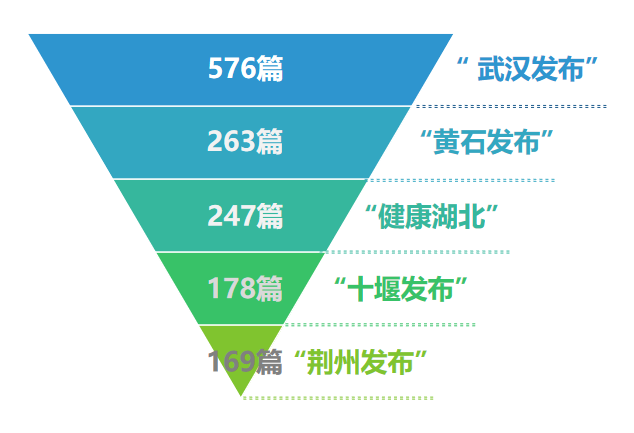 從文章發(fā)布總數(shù)來看,整體較上月有小幅度減少,前五名仍以“發(fā)布系”政務(wù)微信號為主,“武漢發(fā)布”以576篇位居第一,是第二名“黃石發(fā)布”(263篇)的兩倍之多,“健康湖北”以247篇排名第三,“十堰發(fā)布”“荊州發(fā)布”發(fā)文數(shù)未超過200篇,以178篇和169篇位列第四、五名。