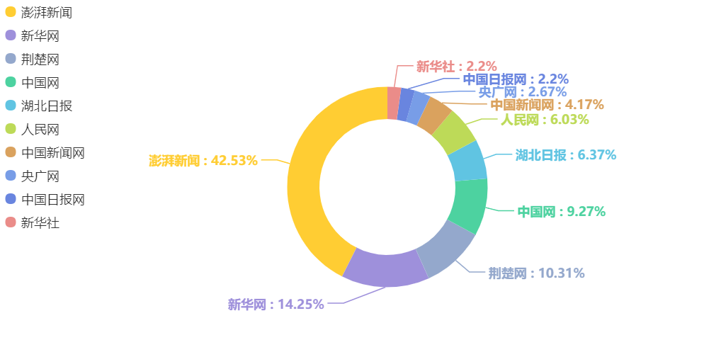 整體分析,對傳播指數TOP10的在鄂各大銀行報道力度較大的省級以上主流媒體前三名分別為澎湃新聞、新華網和荊楚網。其中,澎湃新聞相關報道占比42.53%,新華網占比14.25%,荊楚網占比10.31%。