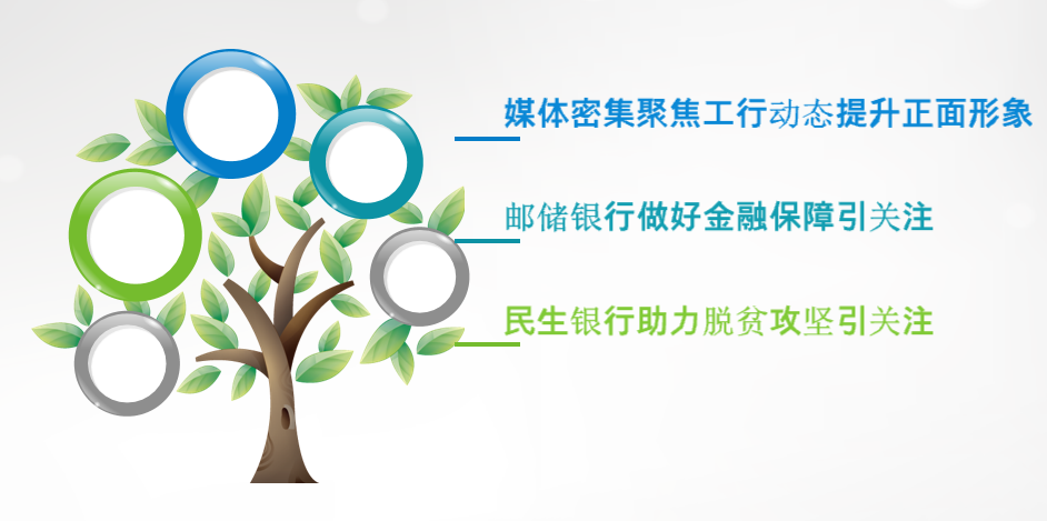 該階段,在鄂銀行積極圍繞湖北重點工作提供金融助力引發媒體聚焦。近期,工商銀行、郵政儲蓄銀行、農業銀行等紛紛圍繞湖北重點項目建設、科技創新、脫貧攻堅等重點工作創新金融服務,引發媒體聚焦和輿論點贊。如工商銀行承諾對湖北重點領域融資支持不低于3000億元,農業銀行湖北省分行提供總金額不低于300億元的意向信用額度助力我省農業科技創新,郵儲銀行增強小額扶貧貸款在帶動貧困戶脫貧增收方面的作用等。