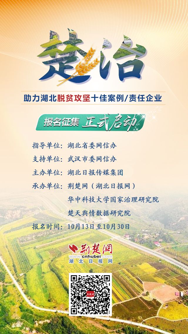 “楚治——助力湖北脫貧攻堅十佳案例、責任企業”推介活動報名征集正在進行,即日起至10月30日,有意愿參選的單位可下載推薦表,填寫后發至郵箱:jcwyqxxb@163.com。咨詢電話:027——88567710,聯系人:盧霜 趙貝。