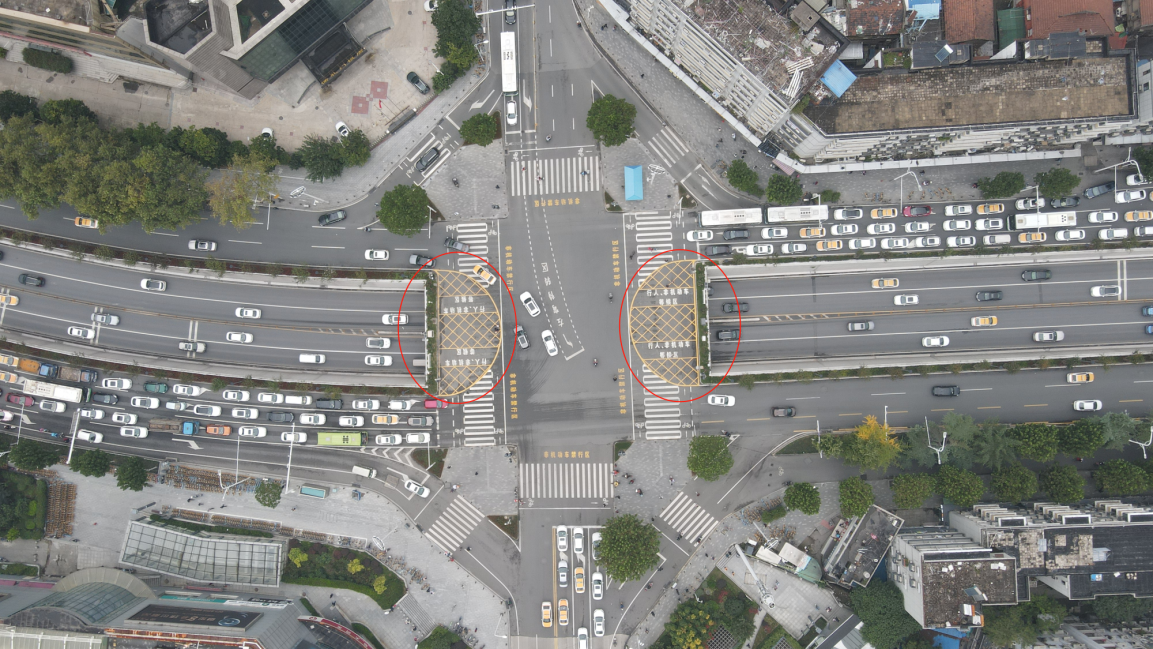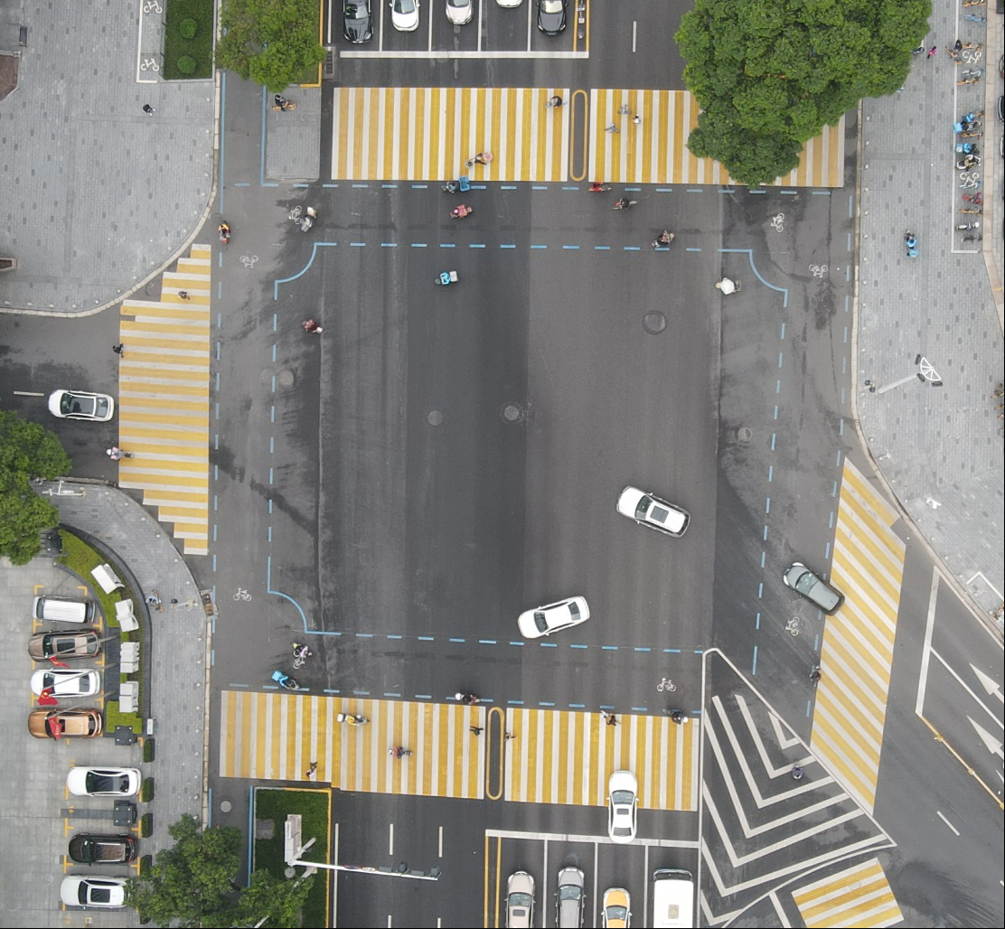 實施效果:規范路口非機動車通行軌跡,實現“人車分離”,給行人、非機動車、機動車三方提供各自的空間,讓三者都能高效、安全通行。