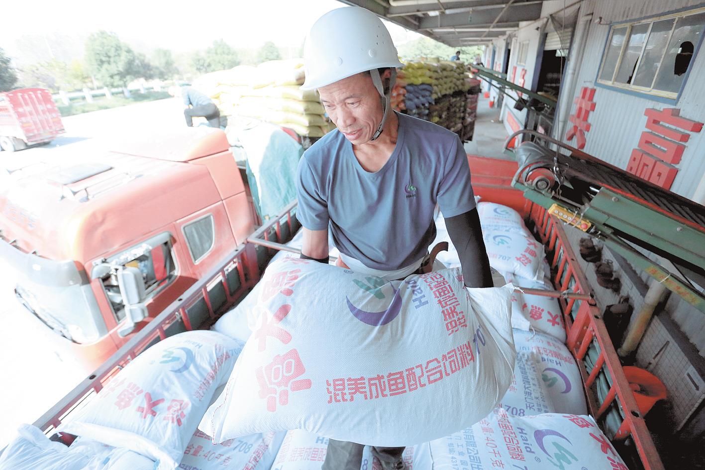 天門海大飼料公司內(nèi),工人正將飼料搬上客戶車輛。(通訊員 劉銀斌 攝)