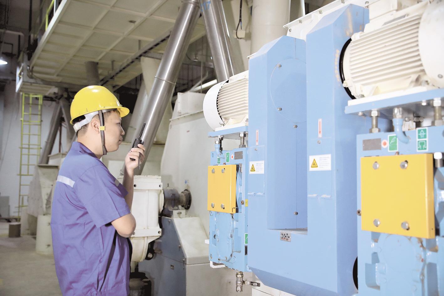 天門粵海飼料公司內(nèi),工人正在操作自動化生產(chǎn)設(shè)備。(粵海公司供圖)