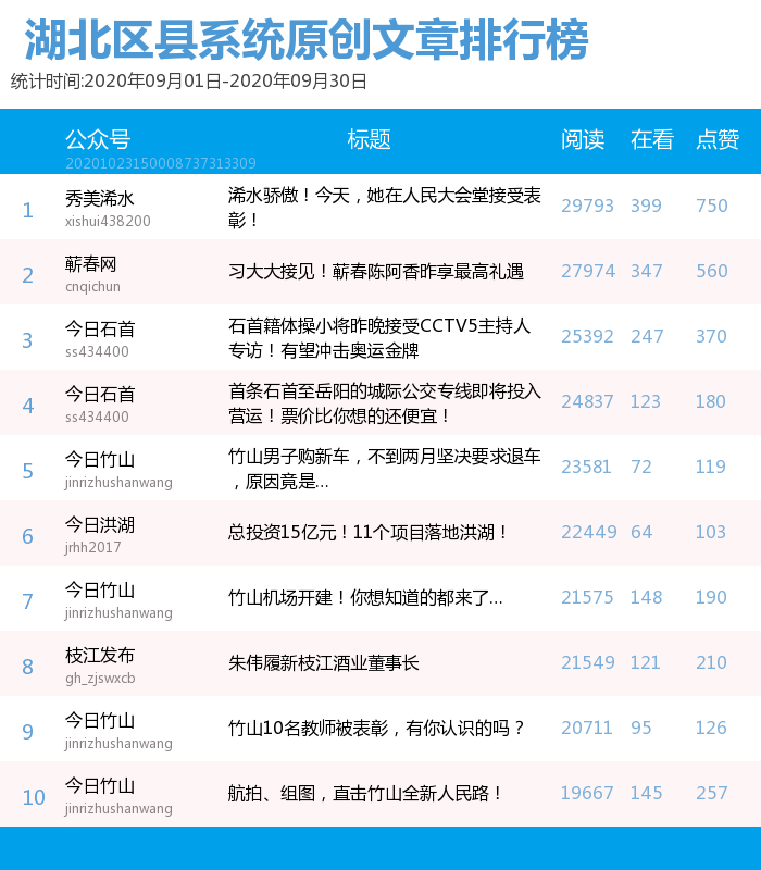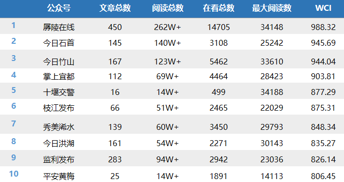 9月,榜單前三甲的位置保持不變,“孱陵在線”“今日石首”“今日竹山”三個公眾號在閱讀總數(shù)、在看總數(shù)、最大閱讀數(shù)等指標上依然占據(jù)優(yōu)勢,WCI排名靠前。公安系的“十堰交警”“平安黃梅”雖然文章總數(shù)相對較少,但WCI指數(shù)較高。相比之下,發(fā)布系的“監(jiān)利發(fā)布”,雖然文章總數(shù)達到283篇,但排名第九,說明不能光靠量多取勝,還要在提高傳播度和留言點贊數(shù)方面下功夫。