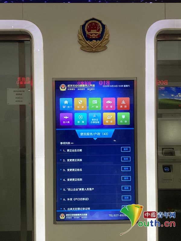 智能觸控引導屏。無人警局的觸控電子屏用來引導群眾查閱辦事流程和服務指南,提供武漢市公安局所有(112個)政務服務事項的服務指南、辦理事項所需材料、辦理時限、辦理單位等,并根據實際情況進行實時更新和維護。 何洌 攝