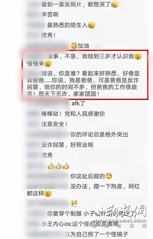 “……爸爸是反詐民警,陪你的時間不多,但爸爸的工作很崇高……”“不急,我的娃三歲才認(rèn)識我,慢慢來……”“最熟悉的陌生人!”“看了第一張照片就想哭”……思念家人的王宇將機(jī)場的短暫團(tuán)聚發(fā)了朋友圈,引來好友們關(guān)心、吐槽和鼓勵。