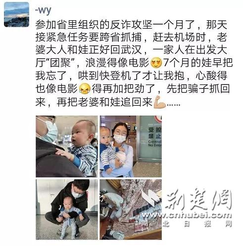 荊楚網(wǎng)客戶端—荊楚網(wǎng)消息(通訊員喻文瀚)“參加省里組織的反詐攻堅工作一個月了,那天接緊急任務(wù)要跨省抓捕,趕去機(jī)場時,老婆大人和娃正好回武漢,一家人在出發(fā)大廳“團(tuán)聚”,浪漫的像電影。7個月的娃早把我忘了,哄到快登機(jī)了才讓我抱,心酸的也像電影。得再加把勁了,先把騙子抓回來,再把老婆和娃追回來……”10月23日,湖北漢川市公安局刑警王宇發(fā)出一條深情的朋友圈引來近百名好友點贊。