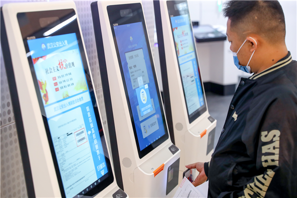出入境智慧服務大廳里,市民在使用自助繳費機 攝影 張暢