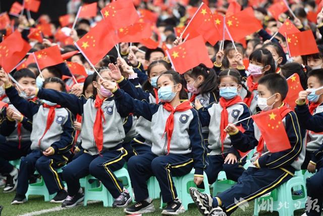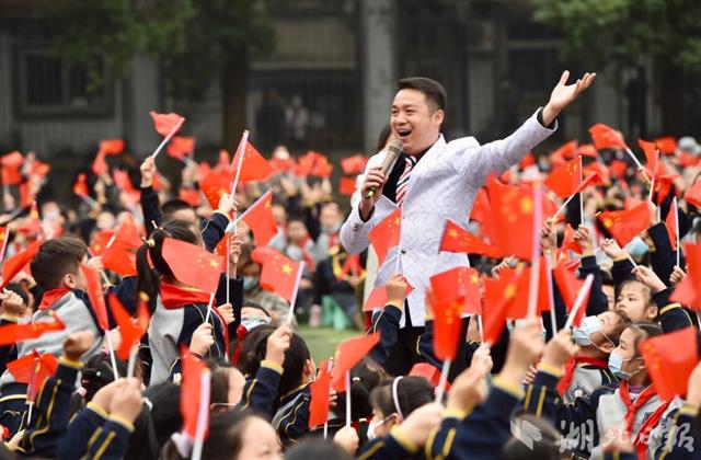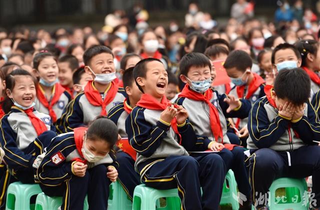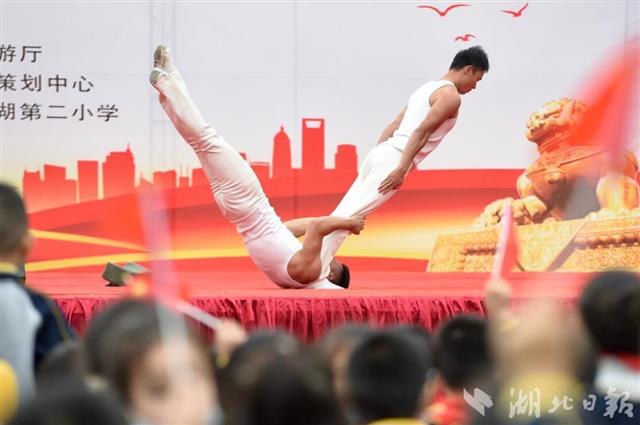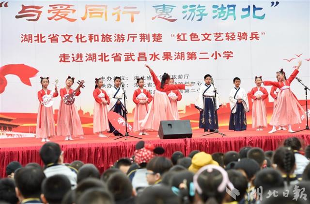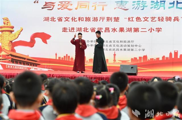 10月28日,由省文化和旅游廳主辦的“與愛同行 惠游湖北”荊楚“紅色文藝輕騎兵”走進湖北省武昌水果湖第二小學,操場上千余名學生觀看演出,精彩紛呈的節目引來陣陣掌聲和歡呼聲。(湖北日報全媒記者 李溪 攝)