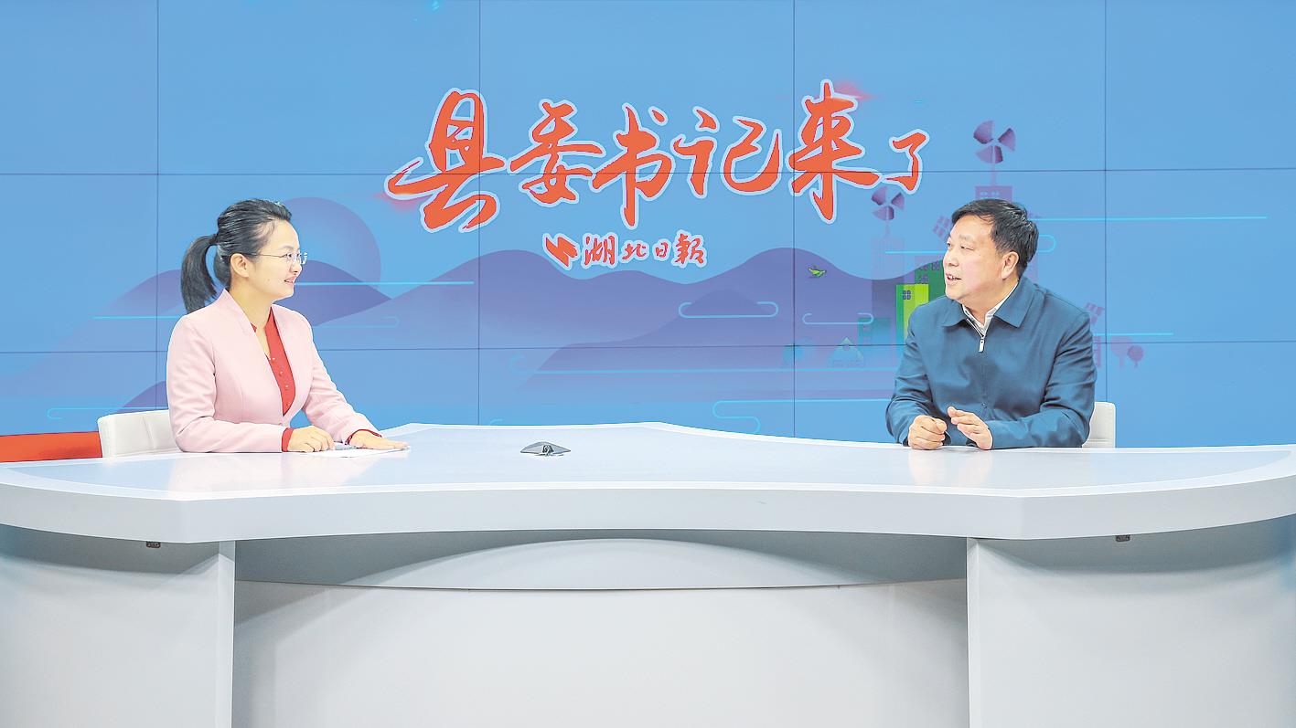咸寧市人大常委會(huì)副主任、通山縣委書記石玉華(右)接受湖北日?qǐng)?bào)全媒記者訪談。(湖北日?qǐng)?bào)全媒記者 梅濤 攝)