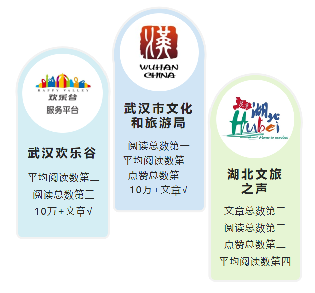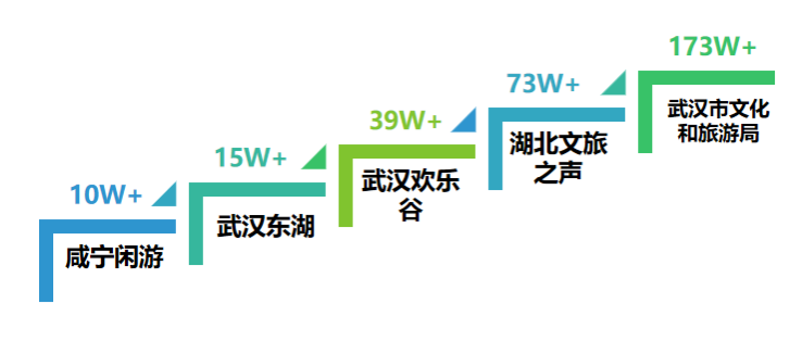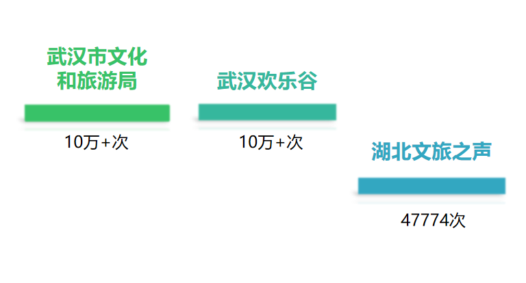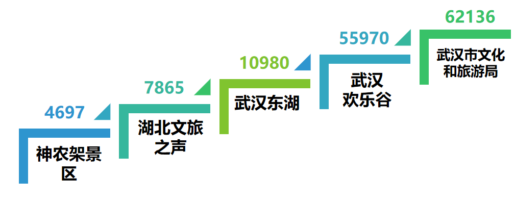 從閱讀總數(shù)來看,整體有小幅度下滑,僅有“武漢市文化和旅游局”一家該項指數(shù)超過百萬,達173萬次。從均篇閱讀數(shù)來看,有3家均篇閱讀數(shù)過萬,分別是“武漢市文化和旅游局”“武漢歡樂谷”和“武漢東湖”。此外,“神農架景區(qū)”雖閱讀總數(shù)排名靠后,但均篇閱讀數(shù)以4697次位列第五。