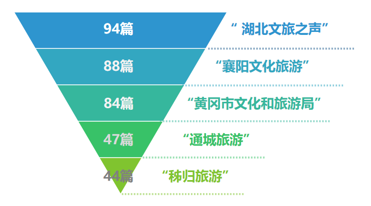 從文章總數(shù)來看,整體發(fā)文量較上月出現(xiàn)小幅減少。“湖北文旅之聲”“襄陽文化旅游”“黃岡市文化和旅游局”以94篇、88篇、84篇排名前三,隨后指數(shù)排名出現(xiàn)斷層,“通城旅游”和“秭歸旅游”分別以47篇和44篇排名第四、五。