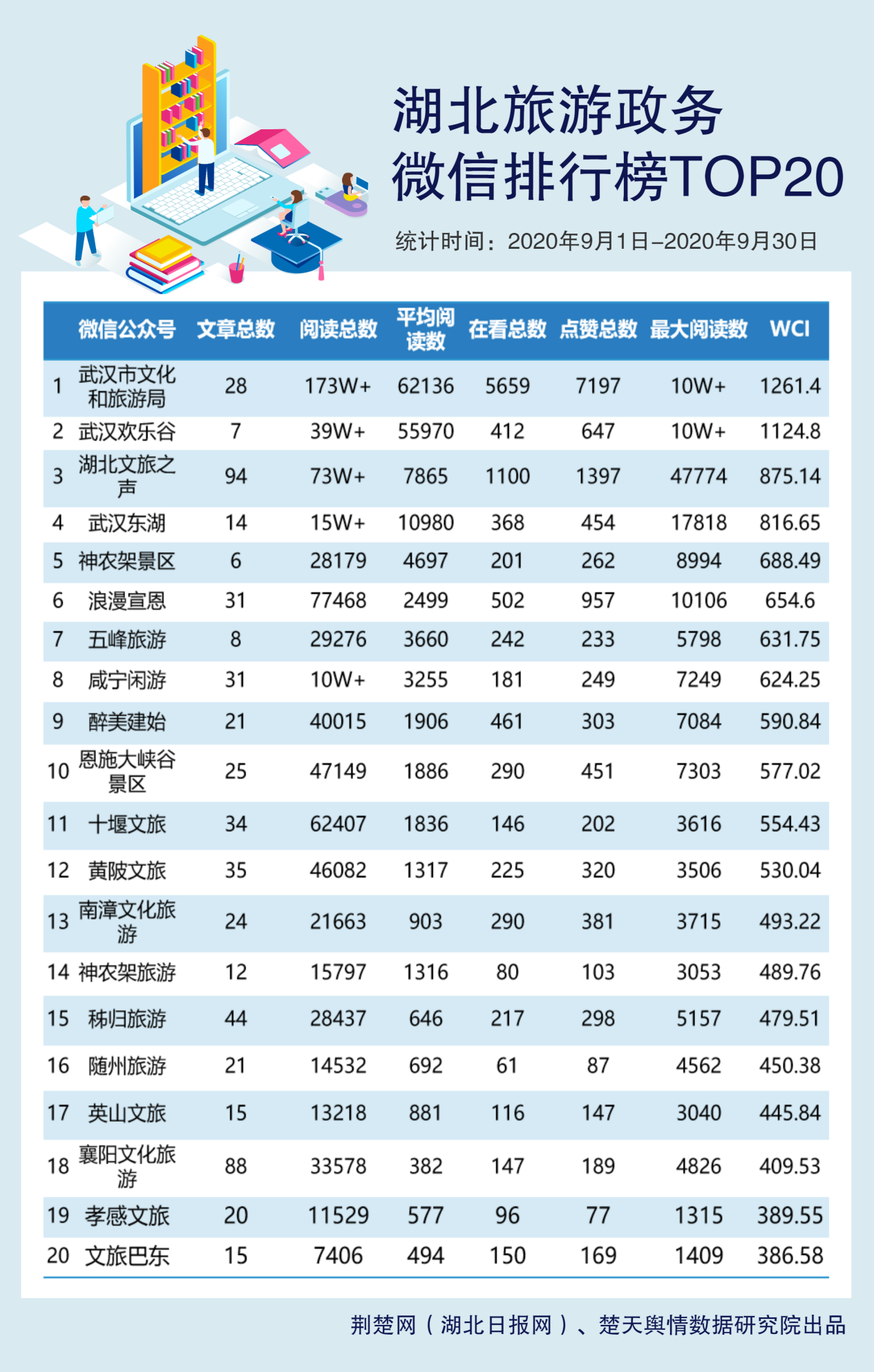 10月29日,由荊楚網(wǎng)(湖北日報網(wǎng))、楚天輿情數(shù)據(jù)研究院制作的湖北旅游政務微信9月榜發(fā)布。整體來看,榜單排名未發(fā)生明顯波動,“武漢市文化和旅游局”“武漢歡樂谷”“湖北文旅之聲”繼續(xù)穩(wěn)坐榜單前三,但本期入榜的微信號WCI指數(shù)較上期整體有小幅下滑。