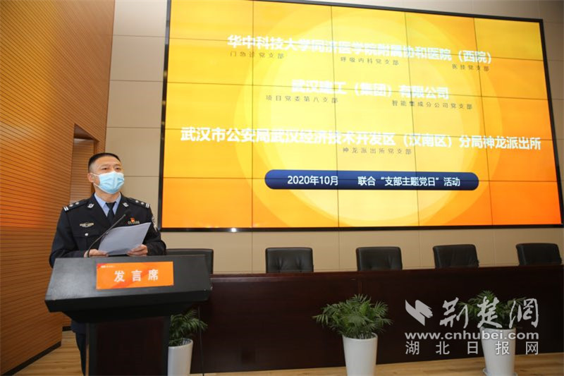 10月29日,在武漢建工集團(tuán)大廈會(huì)議室,一場(chǎng)特殊的支部主題黨日活動(dòng)在這里舉行.來(lái)自武漢協(xié)和醫(yī)院(西院)的醫(yī)護(hù)人員、武漢建工集團(tuán)的建設(shè)者們和武漢開發(fā)區(qū)公安分局神龍派出所的民警一起組織開展聯(lián)合支部主題黨日活動(dòng),弘揚(yáng)抗疫精神,學(xué)習(xí)身邊榜樣。“在火神山建設(shè)工地的日日夜夜讓我終生難忘……”談起那段時(shí)光,武漢建工集團(tuán)的黃昕難掩內(nèi)心的激動(dòng)之情。