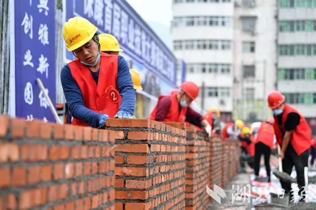 10月30日,參賽選手在保康縣首屆職業(yè)技能大賽總決賽現(xiàn)場進(jìn)行砌筑比賽。