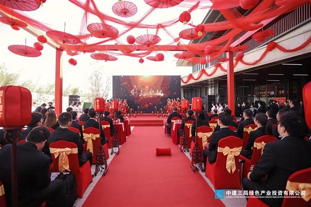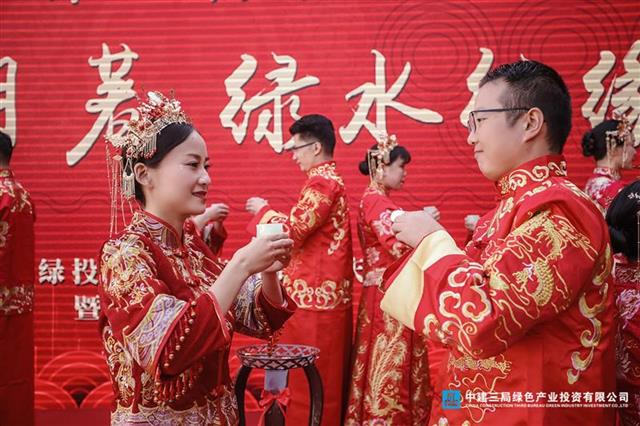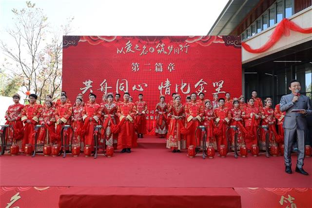 伴隨歡快喜慶的音樂聲,16對新婚夫妻手挽手登上集體婚禮的舞臺,新人們跨馬鞍、踩福袋、邁火盆、描眉、互換囍燈 ……在充滿儀式感和幸福寓意的禮節(jié)中,確認著彼此的情意。16對新人還代表中建三局綠投公司向葛店開發(fā)區(qū)捐贈綠色基金和一顆象征綠色和希望的公益樹。