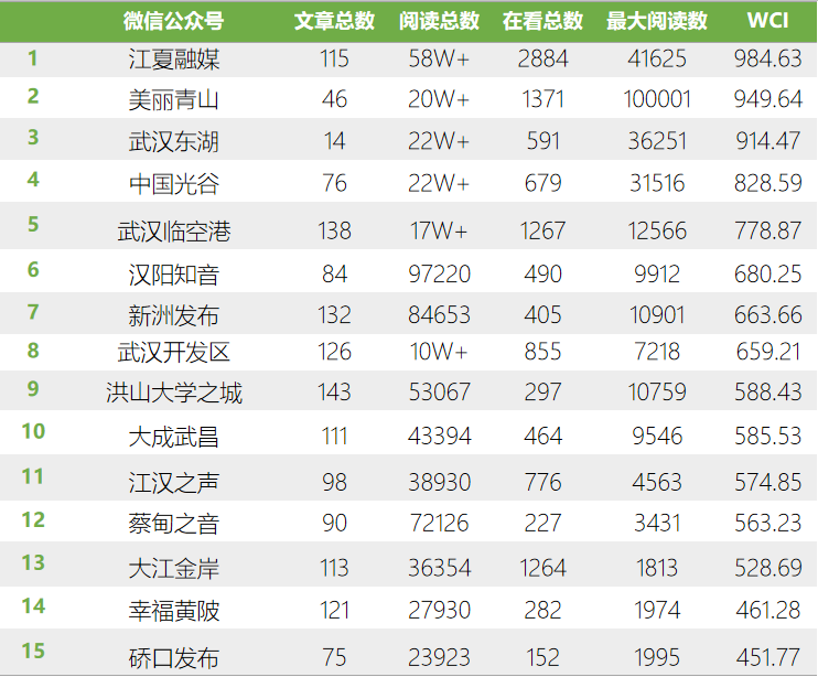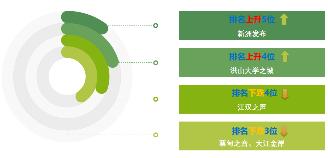 10月,整體排名與9月相比有較大進(jìn)步的公眾號(hào)有:“新洲發(fā)布”排名上升5位,從上期第12躍居本期第7。其余表現(xiàn)不俗的還有:“洪山大學(xué)之城”排名上升4位,“美麗青山”排名上升3位,“大成武昌”上升1位。10月排名下跌的公眾號(hào)有:“江漢之聲”下跌4位,“蔡甸之音”“大江金岸”下跌3位,“武漢臨空港”下跌1位,其余公眾號(hào)排名未出現(xiàn)變化。