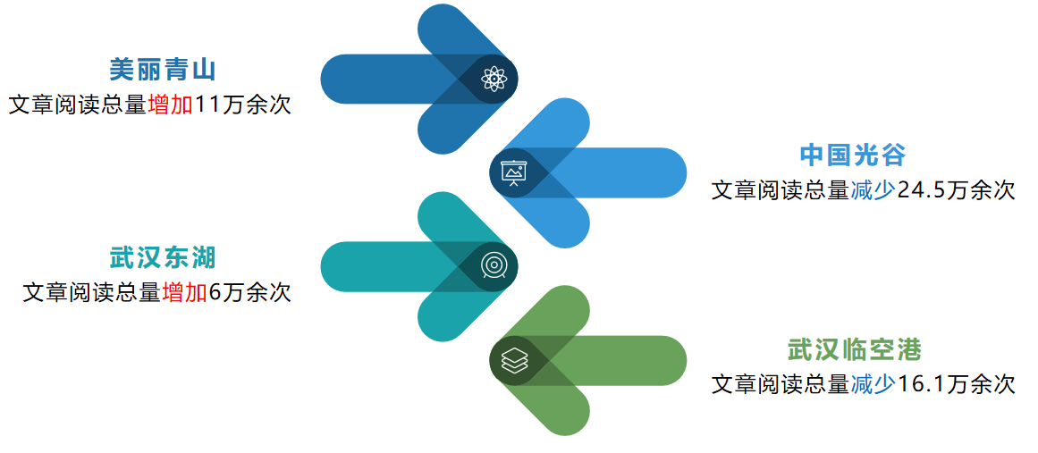 本期,“美麗青山”WCI指數(shù)上漲近300點(diǎn),原因在于其文章閱讀總量較9月增加了11萬(wàn)余次,文章平均閱讀量增加了3102次。“武漢東湖”閱讀總量較9月增加6萬(wàn)余次。本期,“中國(guó)光谷”文章閱讀總量較9月減少24.5萬(wàn)余次,“武漢臨空港”文章閱讀總量較9月減少16.1萬(wàn)余次。